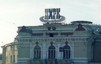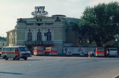 Der Leningrader Zirkusbau, davor die riesige Plakatwand und die Busse, mit denen die Teilnehmer befördert wurden |