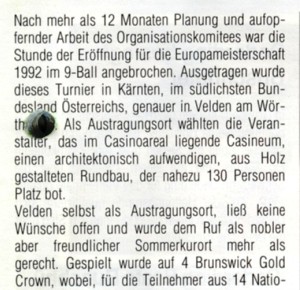 Im Casino Velden fand die 9-Ball EM 1992 statt... |