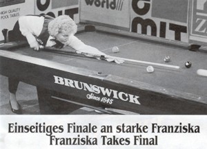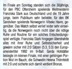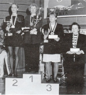 Siegerehrung 9-Ball Damen 1992 v.l. Vibeke Havre, Franziska Stark, Gerda Hofstätter und Helena Thörnfeld |