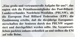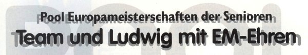 SENIOREN Europameisterschaft 1996 Im 8-Ball wurde Wilfried Strötges Europameister, Franz Krinner wurde Vizemeister Hans-Peter Börgers belegte gemeinsam mit dem Finnen Kari Platz 3 |