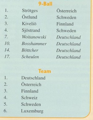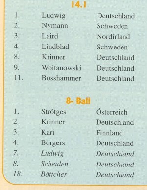 14.1- Europameister 1996 Willi Ludwig Vizemeister wurde der Schwede Hans Nymann, Platz 3 belegten Roy Laird und Per Lindblad |