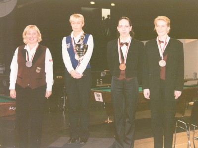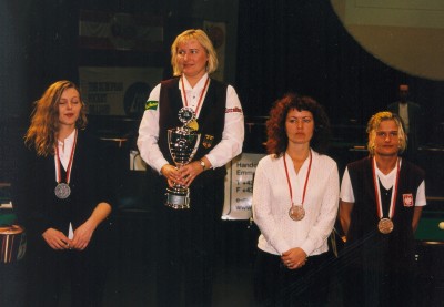 8-Ball Damen 1. Franziska Stark, D 2. Karin Mayet, D 3. Ulrika Andersson, S 3. Grazyna Gronowska, Pl 9-Ball Damen 1. Karin Mayet, D 2. Line Kjörsvik, N 3. Franziska Stark, D 3. Ulrika Andersson, S 14.1- endl. Damen 1. Christina Niklasson, D 2. Franziska Stark, D 3. Daniela Husseneder, D 3. Sandra Ortner, D Team - Damen 1. Schweden 2. Schweiz 3. Deutschland 3. Österreich |