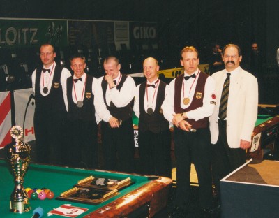 8-Ball Herren 1. Ralf Souquet, D 2. Thomas Engert, D 3. Oliver Ortmann, D 3. Stephane Cohen, F 9-Ball Herren 1. Marcus Chamat, S 2. Ralf Souquet, D 3. Samuel Cleman, CH 3. Mika Immonen, FIN 14.1- endl. Herren 1. Oliver Ortmann, D 2. Alex Lely, NL 3. Thomas Engert, D 3. Stephane Cohen, F Team - Herren 1. Holland 2. Deutschland 3. Schweden 3. Finnland | |||||||||||||||||||||||||||||||||||||||||||||||||||||||||||||||||||||||||||||||||||||||||||||
