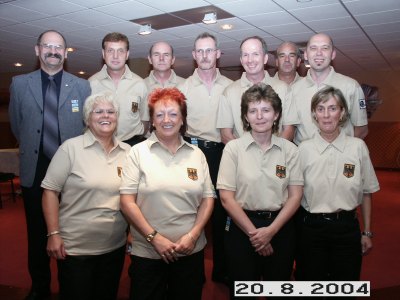 Das Deutsche Senioren Team bei der EM 2003 in Oostende/Belgien v.l. (hinten) Willi Ludwig, Holger Gries, Werner Kohnle, Jörg Rywotzki, Ralf Waschkewitz, Günter Geisen, Team Chef Werner Ertel, Karin Bogs, Klara Lensing, Cornelia Pauritsch, Angelika Weber und Margit Schlosser | ||||||||||||||||||||||||||||||||||||||||||||||||||||||||||||||||||||||||||||||||||||||||||||