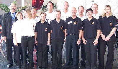 Das Deutsche Team bei der EM 2000 in Bregenz v.l. Team Chef Werner Ertel, Janine Schwan, Daniela Husseneder, Karin Mayet, Sandra Ortner, Diana Stateczny, Franziska Stark, Andreas Roschkowski, Thorsten Hohmann, Oliver Ortmann, Thomas Engert und Ralf Souquet | ||||||||||||||||||||||||||||||||||||||||||||||||||||||||||||||||||||||||||||||||||||||||||||