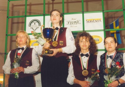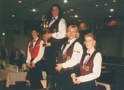 Europameisterschaft 1999 8-Ball-Einzel EUROPAMEISTERIN Ilona Bernhard VIZEMEISTERIN Karren Corr Platz 3 Franziska Stark und Sandra Ortner |