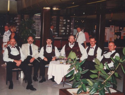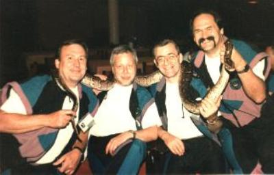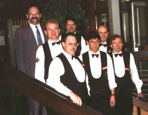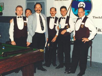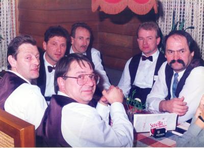 Senioren Europameister Deutschland 1994 in Interlaken/Schweiz nach dem Sieg in gemütlicher Runde... v.l. Fritz Lips, Bernd Woitanowski, Franz Krinner, (vorn) Klaus Wilms, Hans-Peter Börgers und Team Chef Werner Ertel |