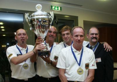 Europameisterschaft Weert/Holland 2004 Europameister -DEUTSCHLAND- v.l. oben Andreas Laykamm, Ralf Waschkewitz und Thomas Damm unten v.l. Günter Geisen Jörg Rywotzki und Werner Ertel |