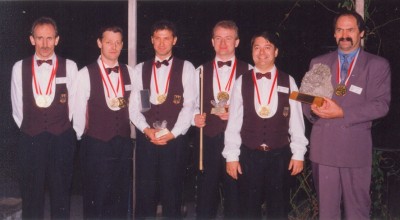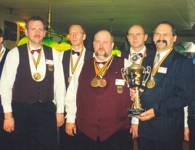 Europameisterschaft Oberhausen 1996 Europameister -DEUTSCHLAND- v.l. Team-Chef Werner Ertel Hans-Peter Börgers, Franz Krinner Jac Bosshammer, Bernd Woitanowski Willi Ludwig und Werner Scheulen |